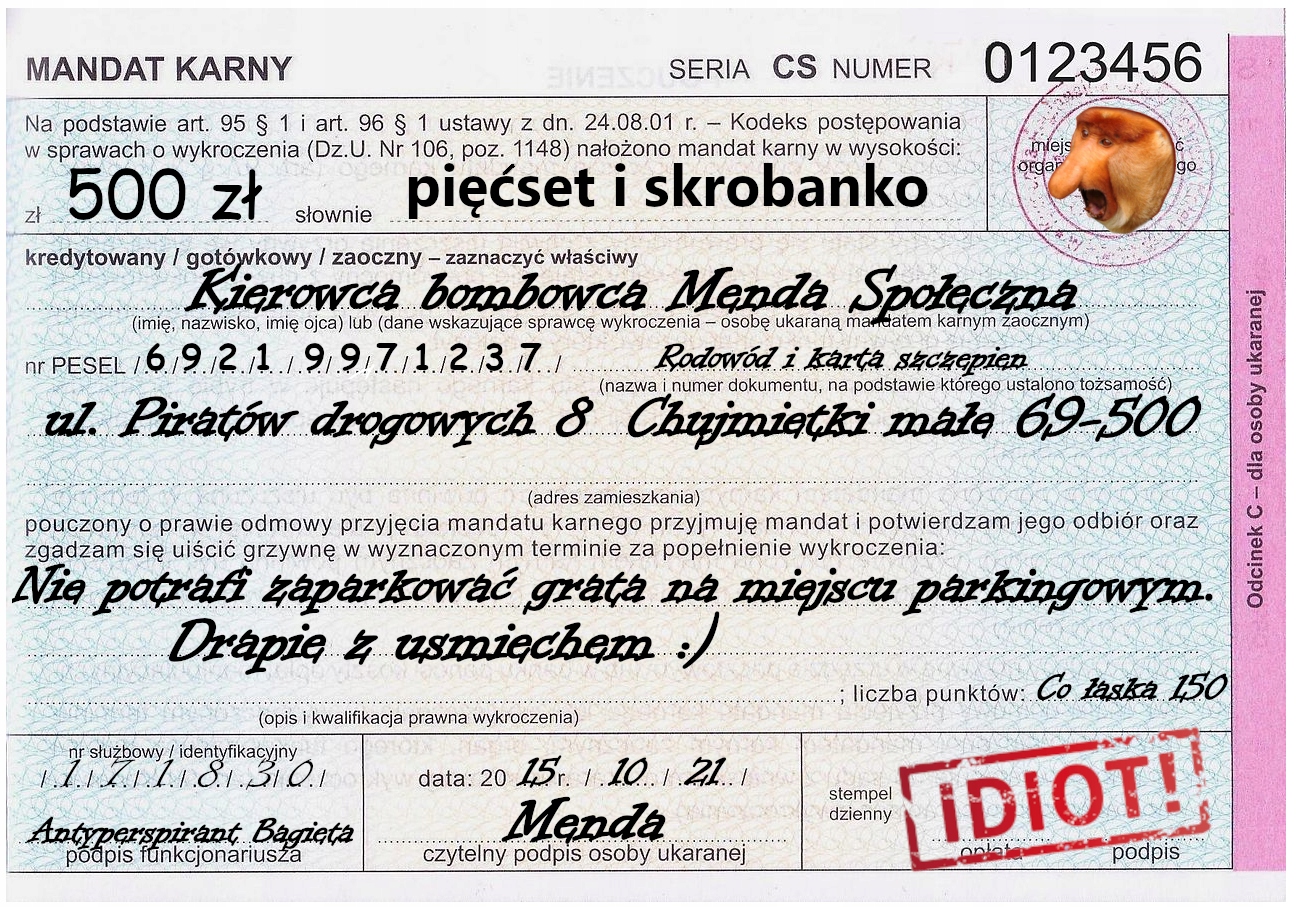 KARNY KU*AS MANDAT NAKLEJKI TRUDNOZRYWALNE 100 szt