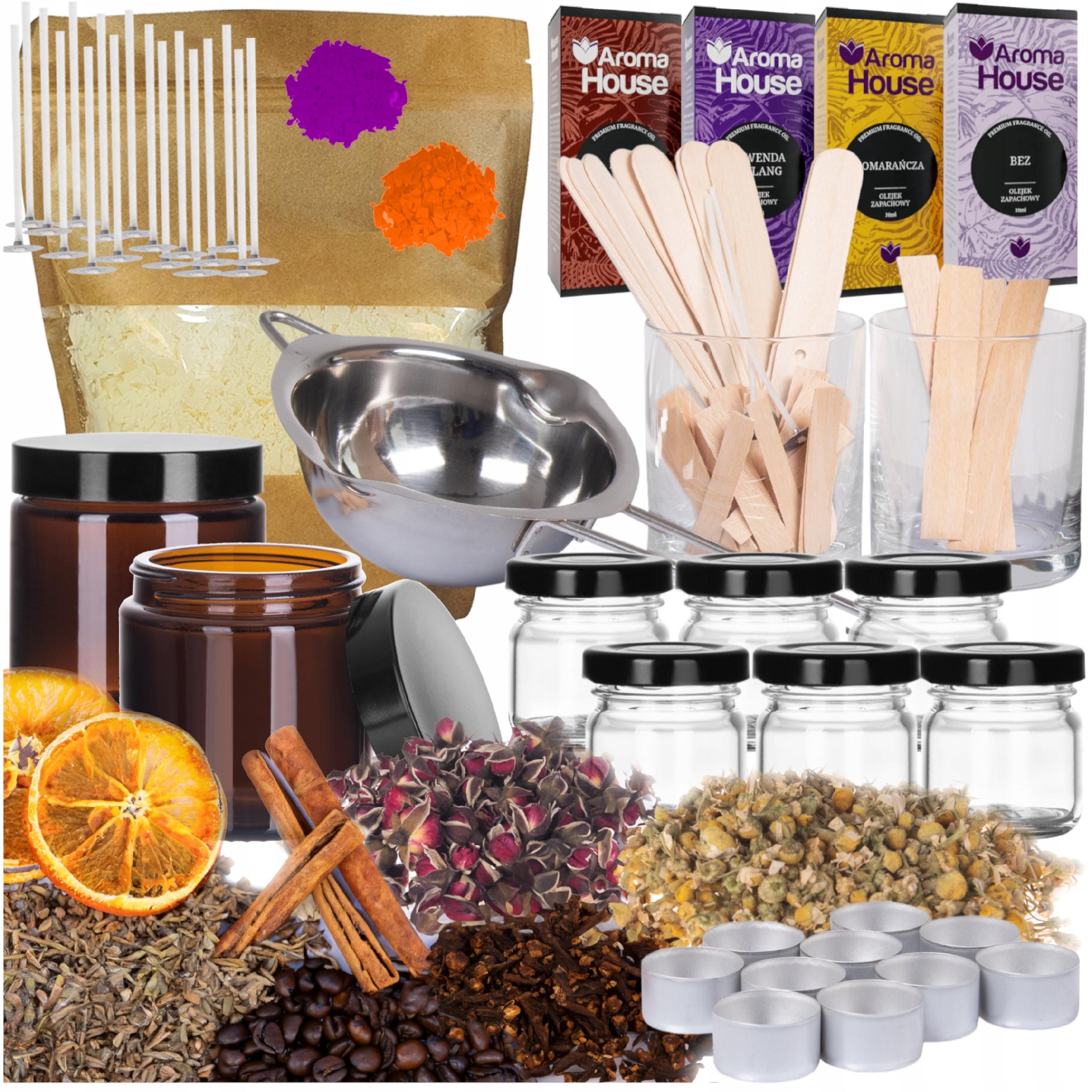 ✅ Zestaw zawiera wszystkie niezbędne elementy do stworzenia własnych świec, takie jak: wosk sojowy, knoty, aromaty oraz szczegółowe instrukcje.